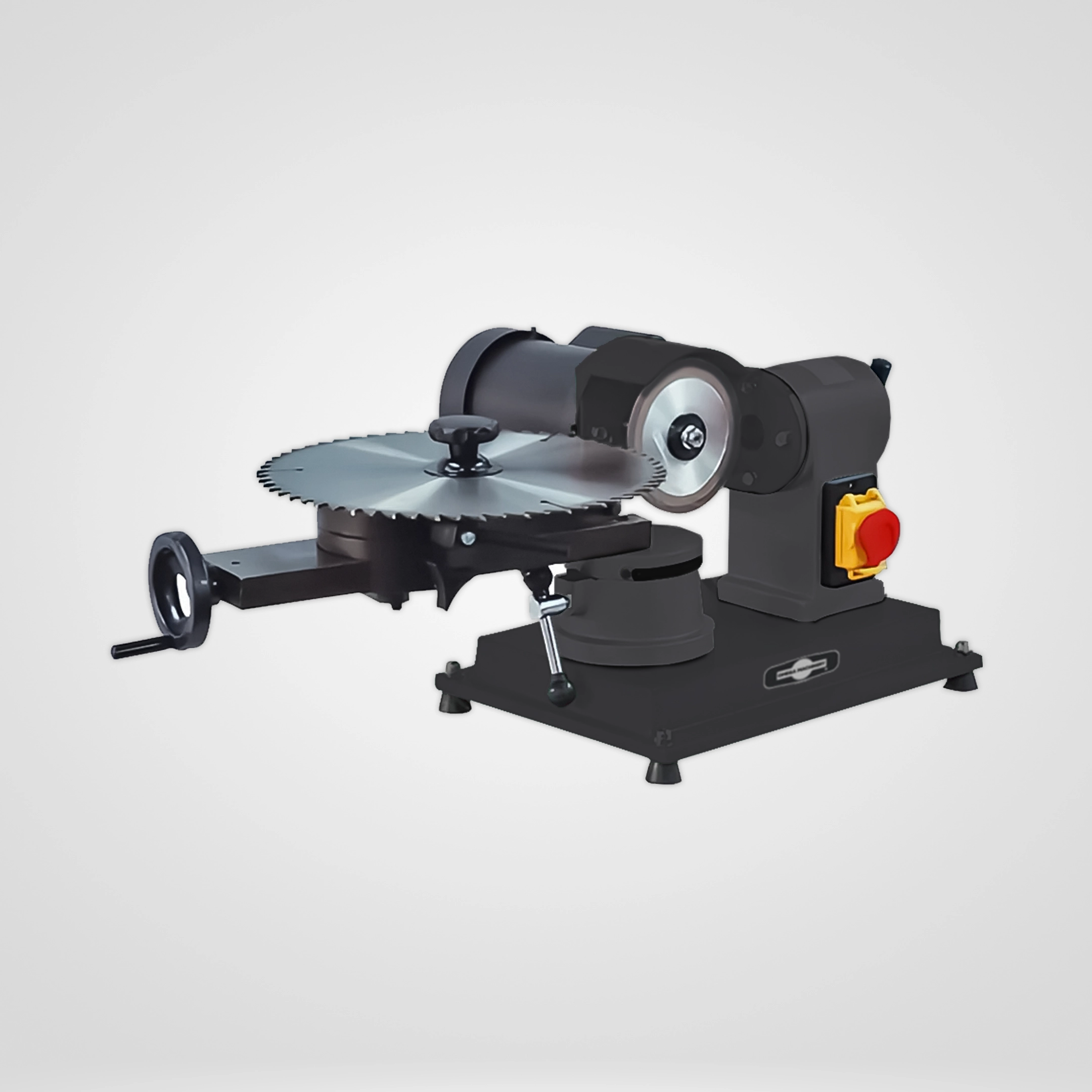 Integra un disco diamantado (rueda de afilado) de 125 mm y un sistema de ajuste angular que permite inclinaciones laterales controladas, facilitando el afilado de diferentes configuraciones de dientes para un acabado uniforme en cada operación.