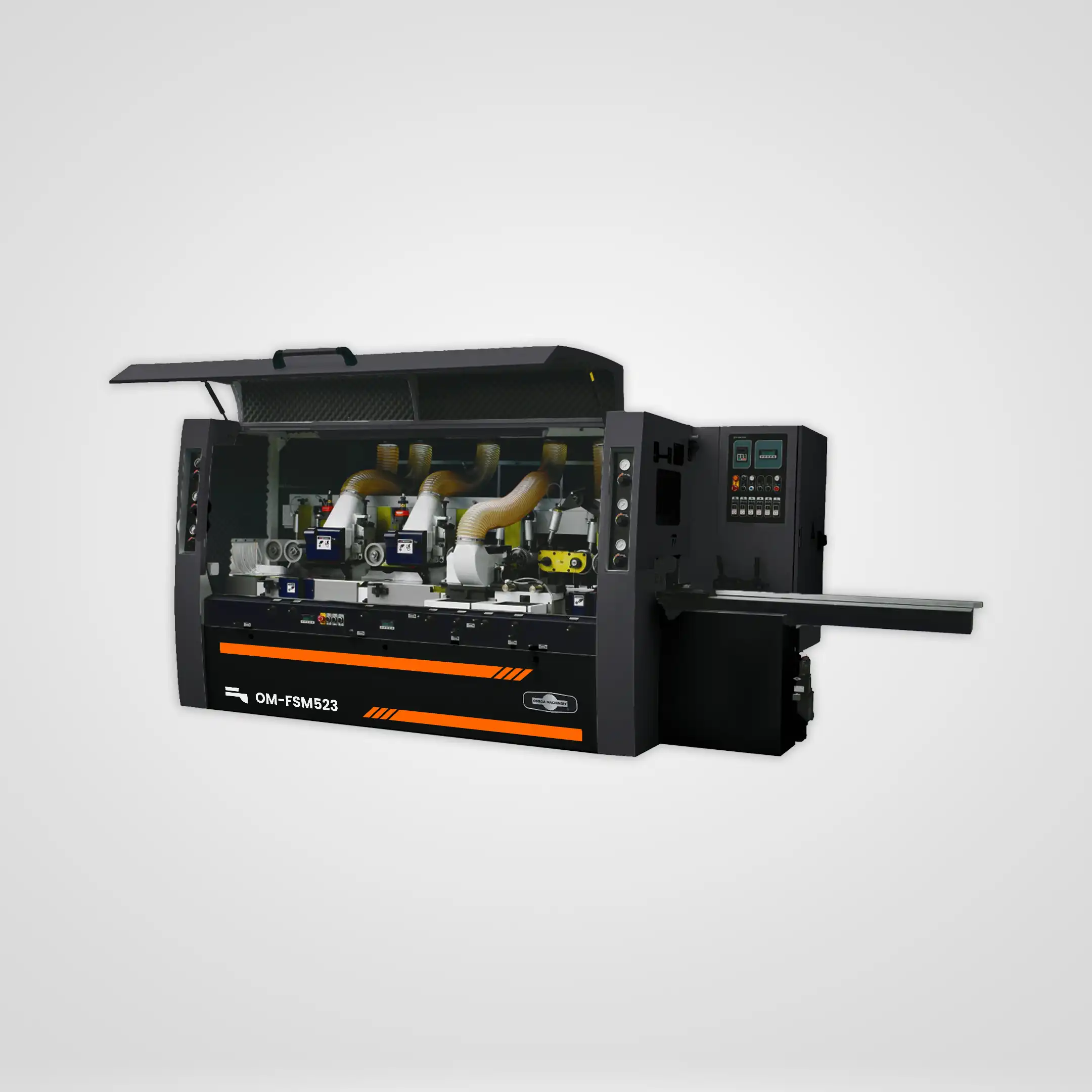 La OM-FSM523 se orienta a quienes necesitan versatilidad adicional en el moldurado de cuatro caras. Gracias a sus 5 ejes, esta máquina logra perfiles más elaborados, optimizando así el flujo de trabajo y disminuyendo la necesidad de pasadas sucesivas.