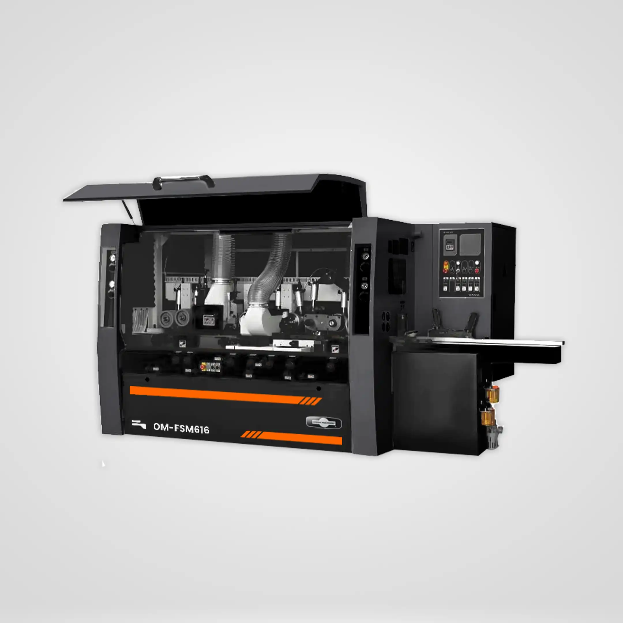 La molduradora de cuatro caras con 6 ejes y 160 mm de ancho de trabajo está pensada para fabricantes que manejan proyectos de gran escala y alta variedad de perfiles. Con la capacidad de ejecutar operaciones de cepillado y perfilado en piezas de madera maciza, tratada o encolada, el modelo OM-FSM616 brinda la eficiencia necesaria para despachar producciones exigentes con consistencia en la calidad.