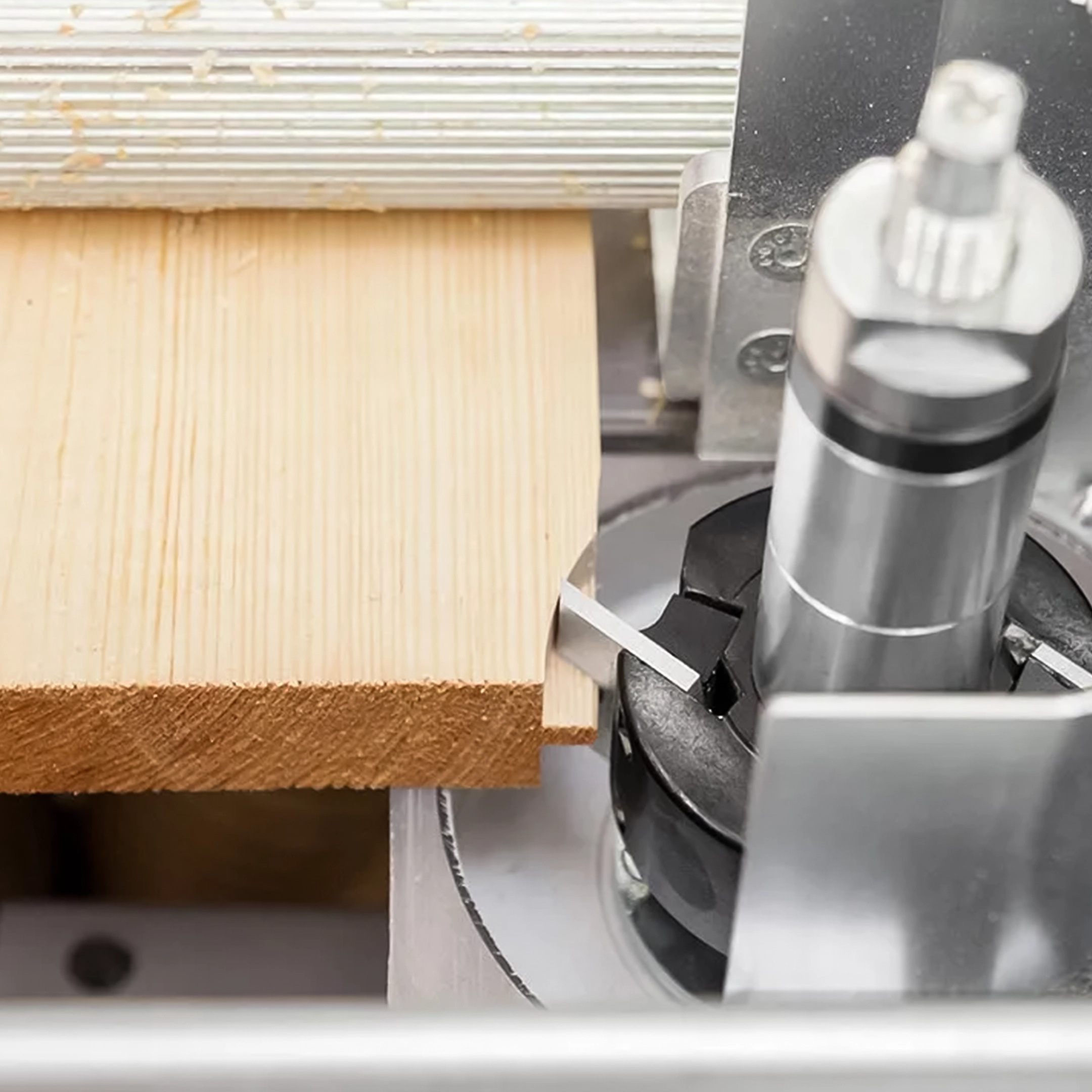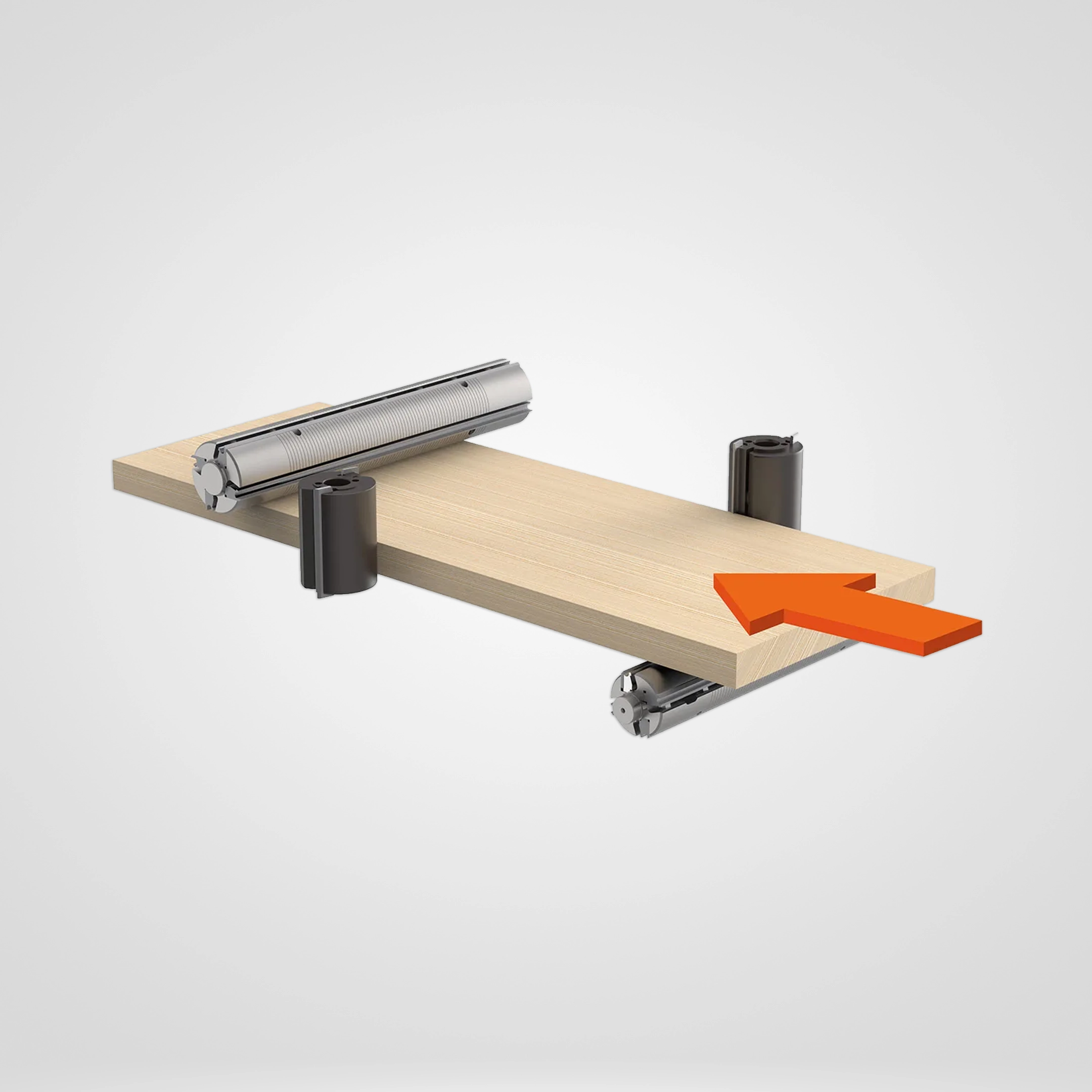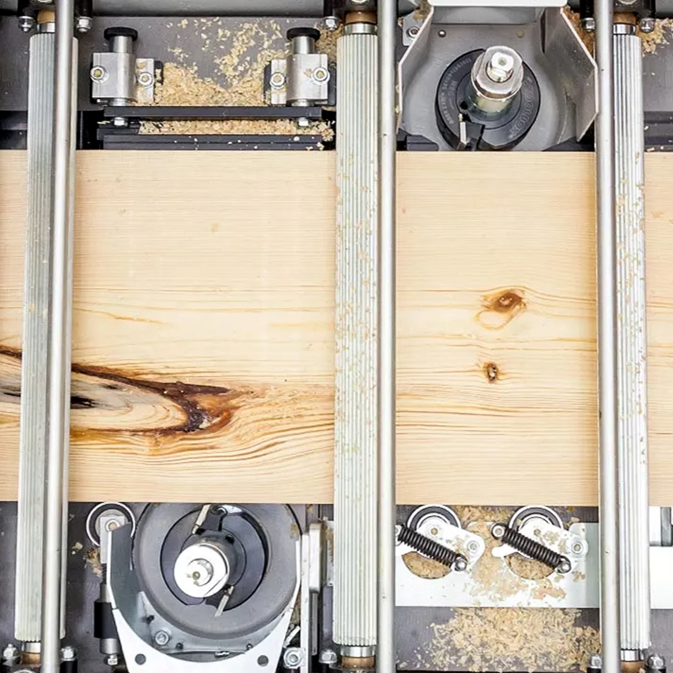 Cuatro rodillos de avance de acero y uno de poliuretano hacen avanzar la tabla de forma continua a lo largo del recorrido de la máquina.