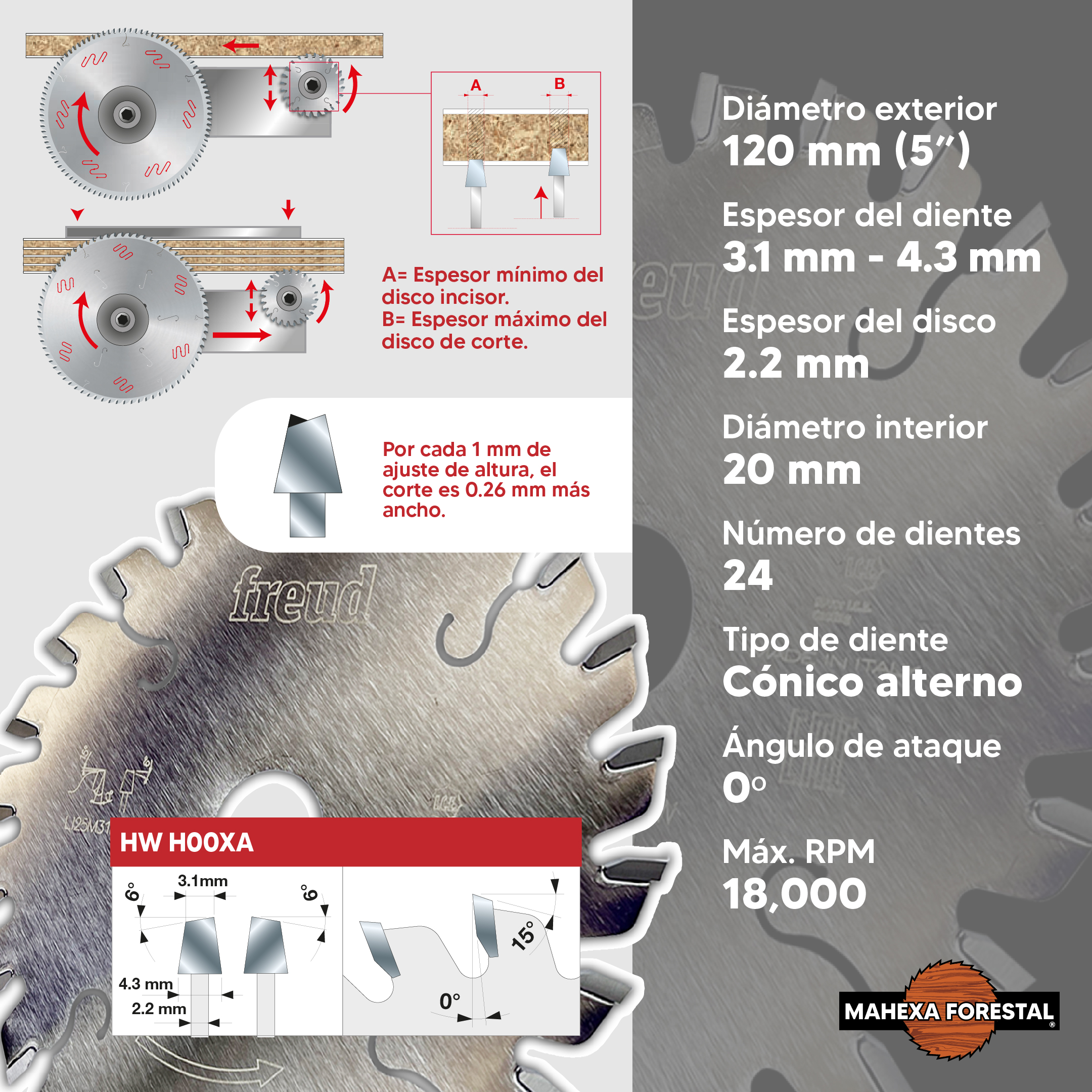 Disco incisor Freud de 5″ con un espesor de diente ajustable entre 3.1 mm y 4.3 mm, un cuerpo de 2.2 mm y 24 dientes tipo ATB, evita astillados en materiales laminados, logrando acabados profesionales.