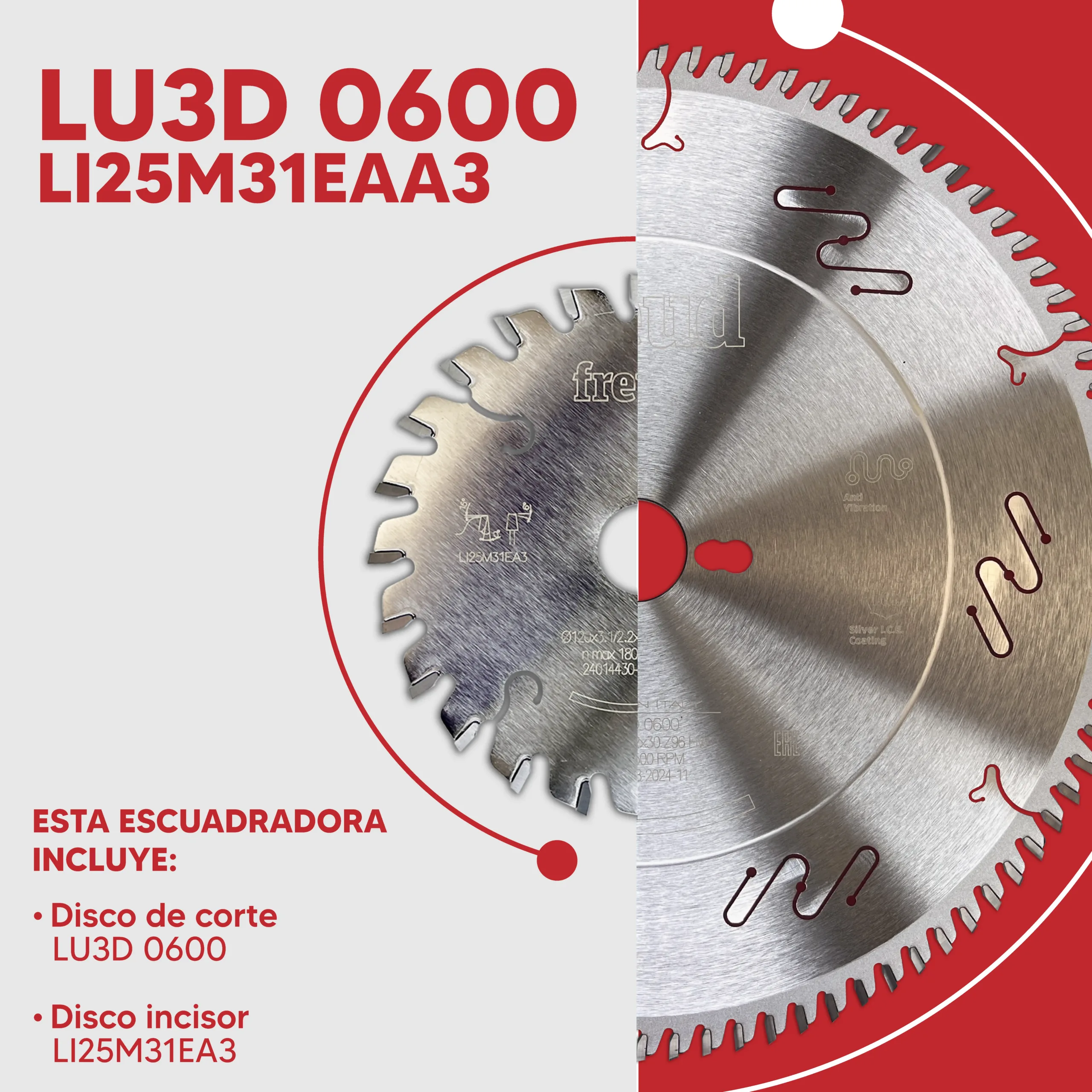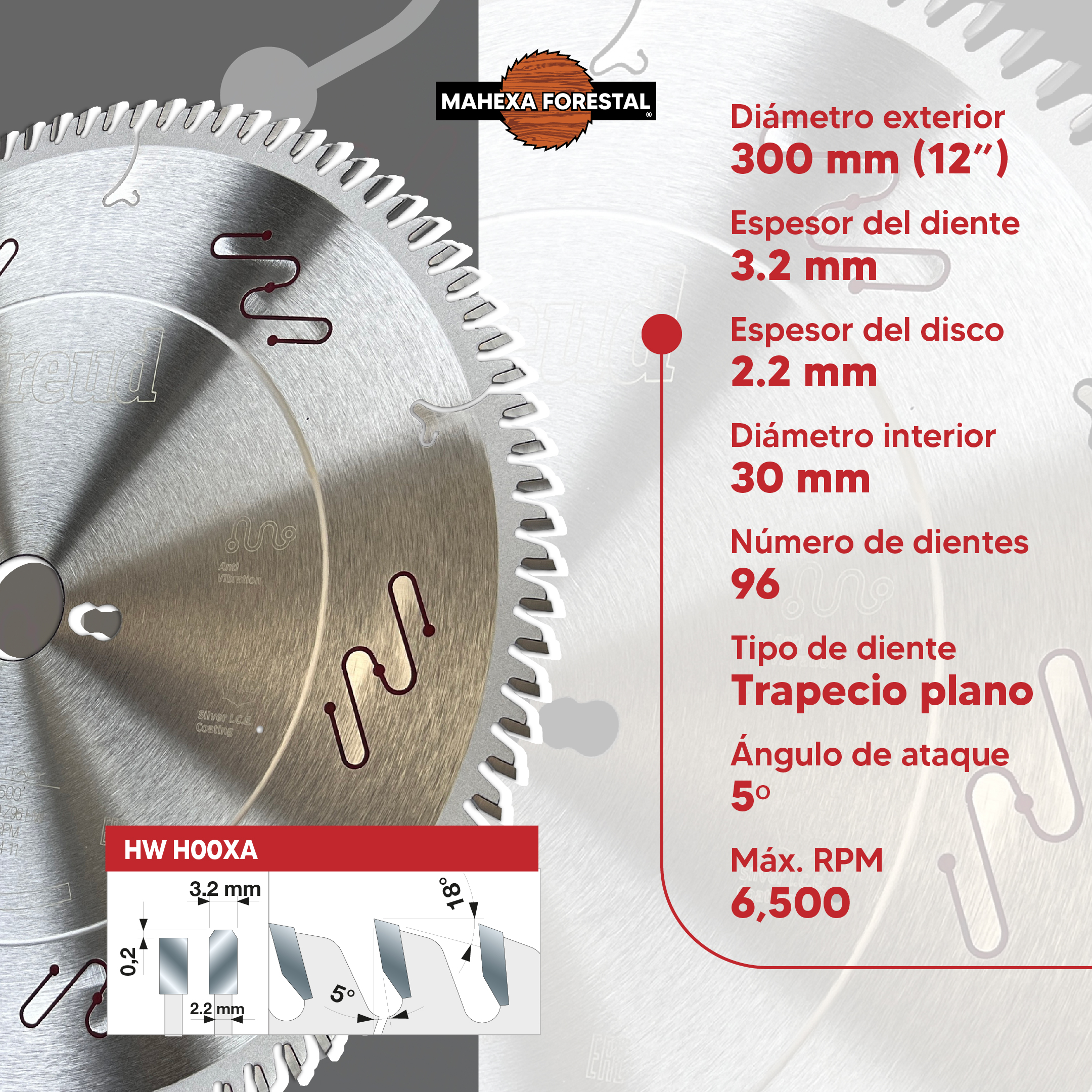 Disco principal Freud de 12″ fabricado en Italia para realizar cortes de alta precisión en los tableros, cuenta con 3.2 mm de espesor del diente, 2.2 mm de espesor del cuerpo, 30 mm de diámetro interior, y 96 dientes tipo TCG.
